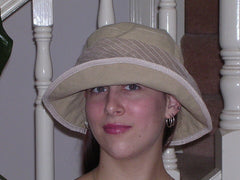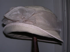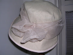 Cielo is the hat that provides both elegance and softness. It is hand made in linen, and the edge of the brim is framed in six rows of Swiss braid which adds beauty and firmness to the hat. It is trimmed in soft organza around the hat front, featuring rows of stitches along (butterfly) or an organza sash that ties up in a soft informal bow. Cielo is fully lined and has an elastic in the inside head-band to allow you to adjust the size at any time.