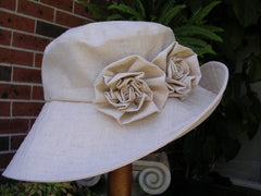 Simply beautiful, practical and protective,this style made in cream color linen has a broad brim to ensure sun protection and elegance. It has 3 roses made in the same linen and is fully lined. To ensure a firm fit it has an elastic in the inside head band.